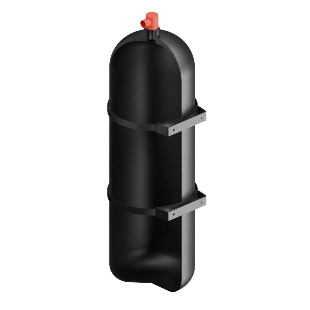 - "Helium tank, 9 in x 2.5 ft, top valve, 2 clamps"